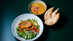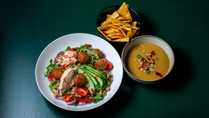 Zupa sezonowa - wegetariańska, miska Tabbouleh i Falafel - ogórki, pieczona cieciorka, hummus, pomidorki, zioła, nasiona i sos Cajun oraz dodatek do wyboru