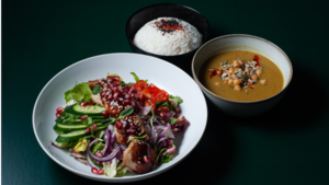 Zupa + Sałata BBQ kurczak z sezamem i owocem granatu + Dodatek