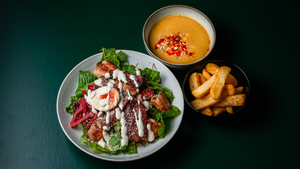 Zupa sezonowa - wegetariańska, Sałata BBQ z kurczakiem, ogórkami, czerwoną cebulką, owocem granatu oraz dodatek do wyboru
