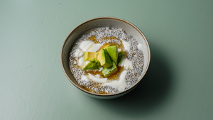 312kcal 9g białka/ 20g tłuszcze/ 21 węglowodanów Chia pudding to lekkie i pożywne śniadanie, przygotowane na bazie nasion chia namoczonych w mleku migdałowym. Bogate źródło błonnika, białka i zdrowych kwasów tłuszczowych. Z jogurtem, kokosem, awokado i odrobiną syropu klonowego