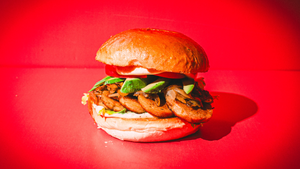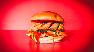 Bułka brioszka, chrupiący kurczak w Panko, koreański słodki sos chilli, domowe Kimchi, ogórek, dymka, daikon pikle