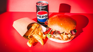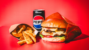 Podwójny cheeseburger, Pepsi 0.2 oraz frytki belgijskie w zestawie. Dwa kotlety, dwa plastry sera Cheddar, ogórki, sałata, sos własny