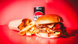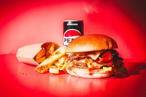 Podwójny bekon cheeseburger, Pepsi 0.3 oraz frytki belgijskie w zestawie. Dwa kotlety, dwa plastry sera Cheddar, podwójny becon, ogórki, sałata, sos własny
