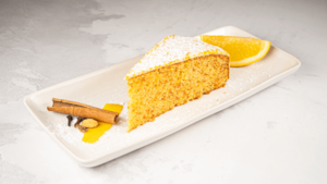 Domowy hash brown, sadzone jajko, plastry grillowanego bekonu, pomidor, różne sałaty serwowane z ciastem marchewkowo - pomarańczowym